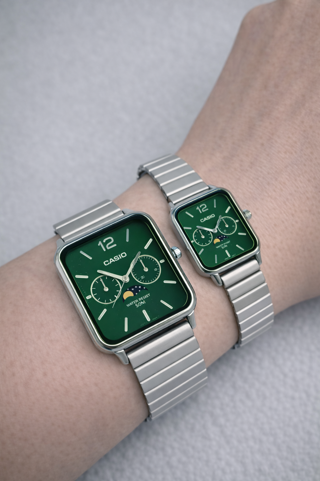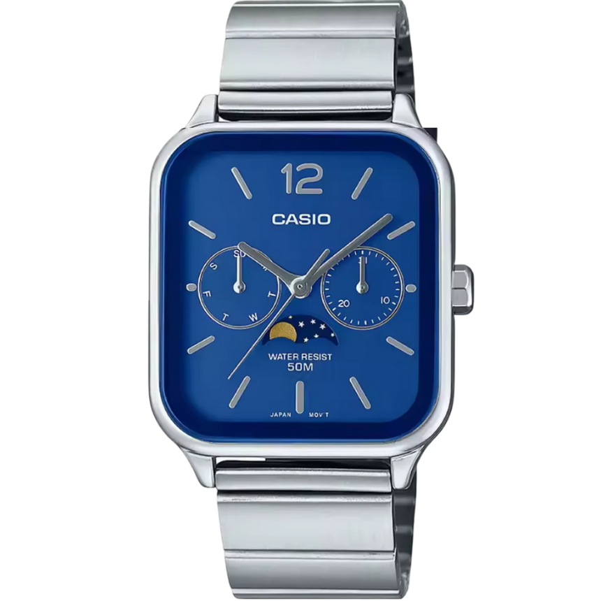 Casio MTP-M305 serisi, günlük yaşamlarına zarafet katmak isteyenler için mükemmel bir saat. Dikkat çeken özelliği, saat 6 konumunda bulunan ve ayın evrelerini romantik bir şekilde gösteren ay evresi mekanizması. Bu mekanizma, her biri üstte ve altta ayı gösteren iki diski 59 günde bir döndüren benzersiz bir teknoloji kullanıyor ve diskin üst yarısını ortaya çıkararak ay evresini gösteriyor. Yaklaşık 29,53 günlük ay yörünge periyoduna dayanan bu mekanizma, saat yapımcılığının doruk noktasını temsil ediyor ve hatayı en aza indiriyor. Bir zamanlar denizciler tarafından gelgitleri belirlemek için kullanılan ay evresi mekanizması, artık saat kadranını süsleyen güzel bir dekoratif unsur. Şık dikdörtgen kasa, akıllı saatleri anımsatan modern bir tasarıma sahip ve ona kentsel bir hava katıyor. Akordeon tarzı paslanmaz çelik kayış, modern döneme retro bir çekicilik katarken her kıyafete sofistike bir vurgu katıyor.